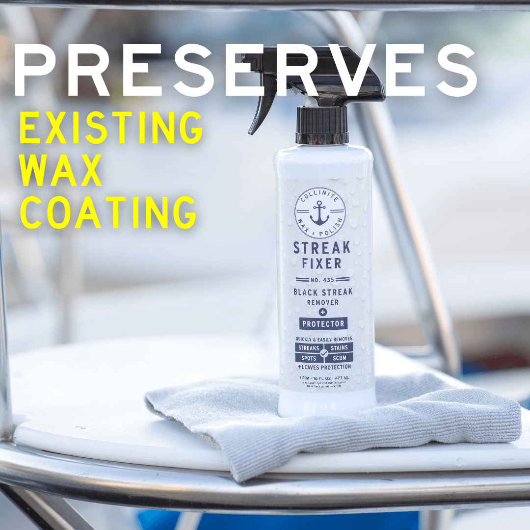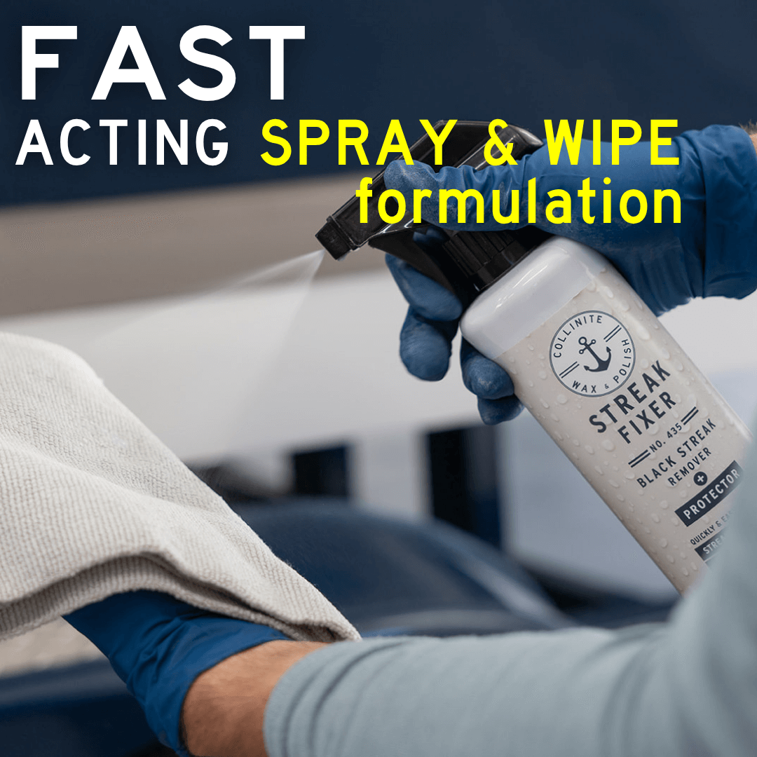 Your all new, on-deck all in one. Easy to use No. 435 Black Streak Remover + Protector safely and effectively eliminates black streaks, tough stains and fresh water spots from fiberglass surfaces. Quickly restores finish while leaving behind fast-bonding polymer surface protection. Safe for use on fiberglass, metal and painted surfaces. Preserves your existing coat of Collinite Marine Wax. Not for glass or upholstery. Not designed for oxidation removal (where a compound or polish* would be better utilized) or heavily soiled surfaces requiring a pre-wash.